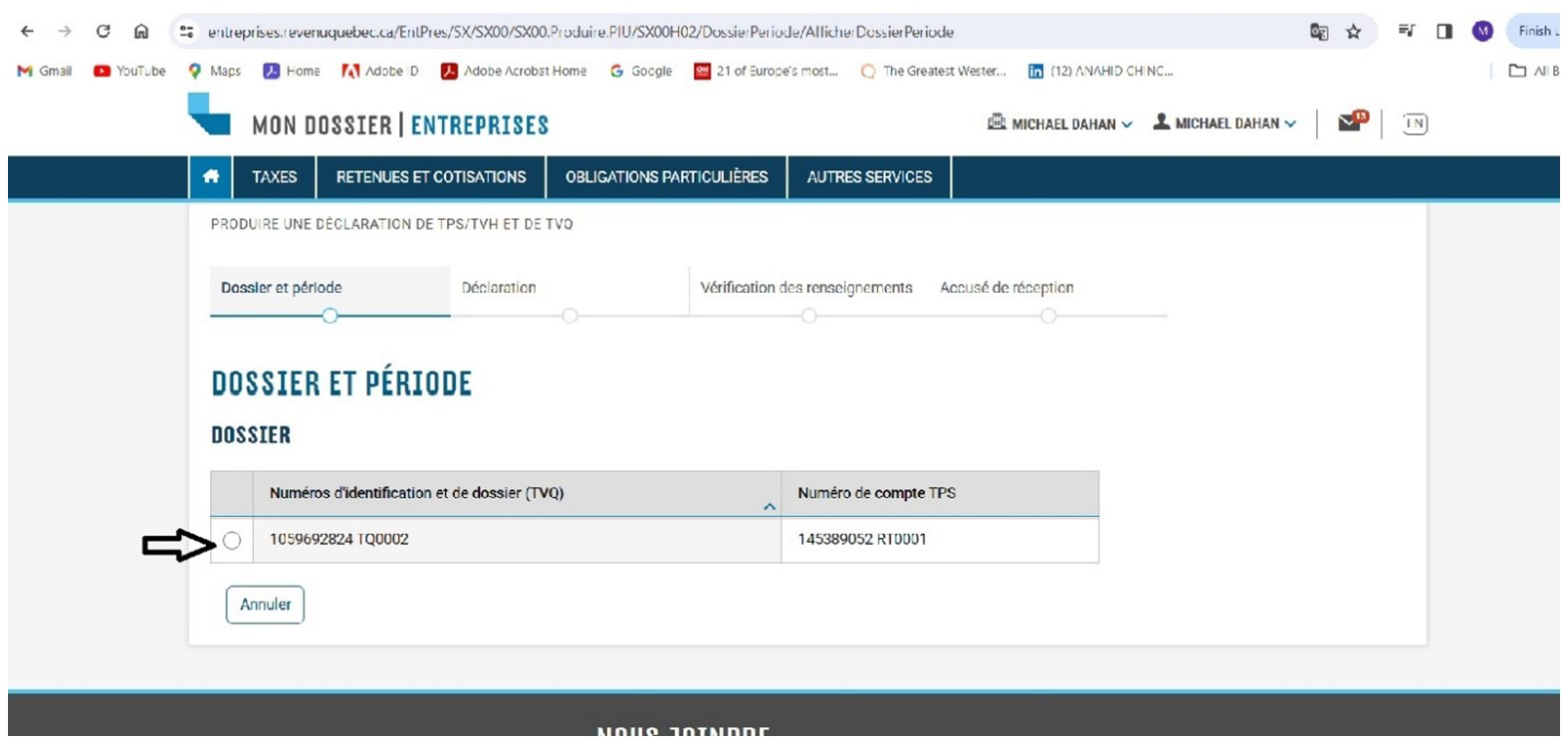 Sélectionnez l’entreprise pour laquelle vous produisez le rapport TPS/TVQ. Pour la plupart des gens, il n’y aura qu’une seule option.
