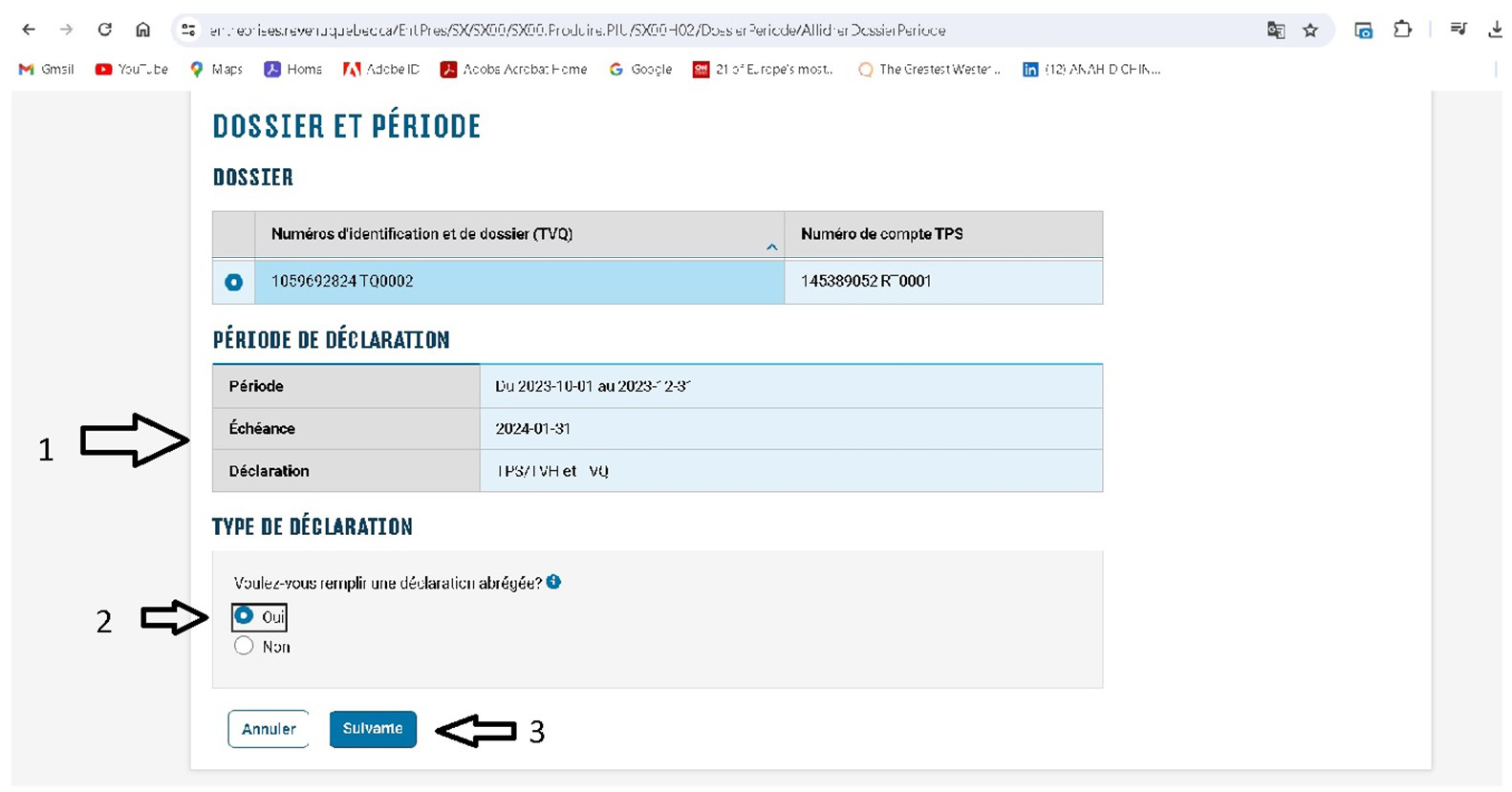 Une fois la sélection faite, vous verrez la période couverte par le rapport et on vous demandera si vous souhaitez faire « La déclaration abrégée ». C’est ce que nous allons utiliser.