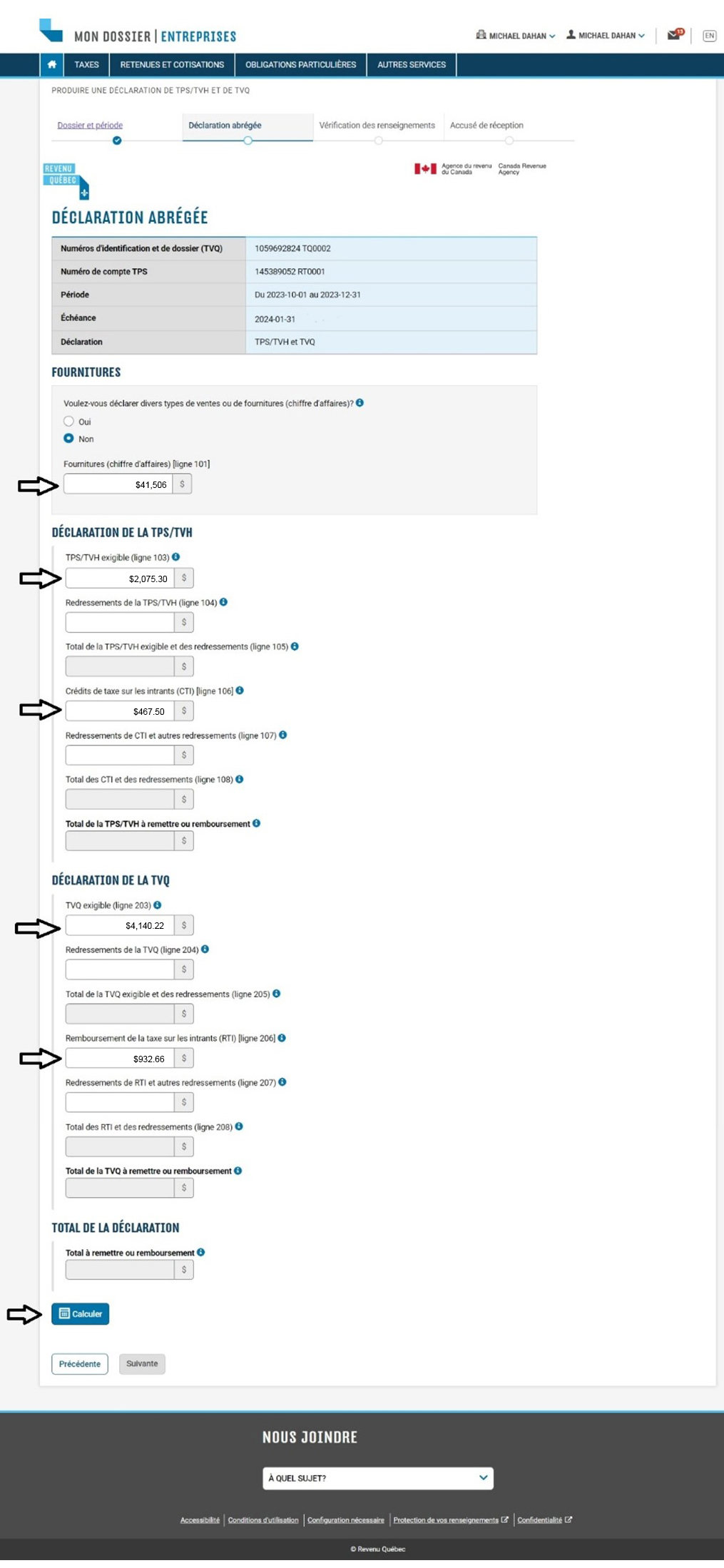 Lorsque vous appuyez sur « Calculer », le système affichera que vous devez un total de $4,815.36 (TPS de $2,075.30 – $467.50 = $1,607.80 et TVQ de $4,140.22 – $932.66 = $3,207.56).